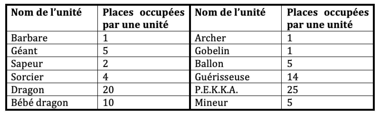 On se propose de faire une étude du jeu vidéo « Clash of Clans », et d’étudier plus précisément le principe de formation des armées. En tant que joueur, on peut élaborer des armées avec des troupes de nature différentes, plus ou moins élaborées selon le niveau de jeu. Chaque armée est constituée d’unités de combat (exemple : barbare, archer, géants, sorciers…) qui chacune prend plus ou moins de place dans l’armée. Par exemple, un barbare prendra 1 place, un archer 1 place, un géant 5 places etc… En fonction de son niveau de jeu (pour les connaisseurs du jeu : ce niveau de jeu est déterminé par l’hôtel de ville (le fameux « HDV »)), on peut fabriquer une armée plus ou moins grande. Par exemple, à partir du niveau 7, on peut faire une armée qui prend 200 places : on peut donc en théorie y mettre 200 barbares (qui prennent 200*1 = 200 places), ou 40 géants (qui prennent 40 * 5 = 200 places), ou on peut faire des mix d’unités (exemple : 20 géants (= 20 * 5 = 100 places) + 50 archers (= 50 * 1 = 50 places) + 50 barbares (=50 * 1 = 50 places)).
