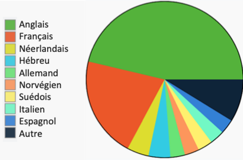 On a retrouvé ci-dessous, sur Wikipedia, le graphique circulaire représentant la proportion respective de chaque langue parmi les 68 chansons vainqueur. On a regroupé les langues qui n’ont gagné qu’une fois dans un seul secteur nommé « Autre ».