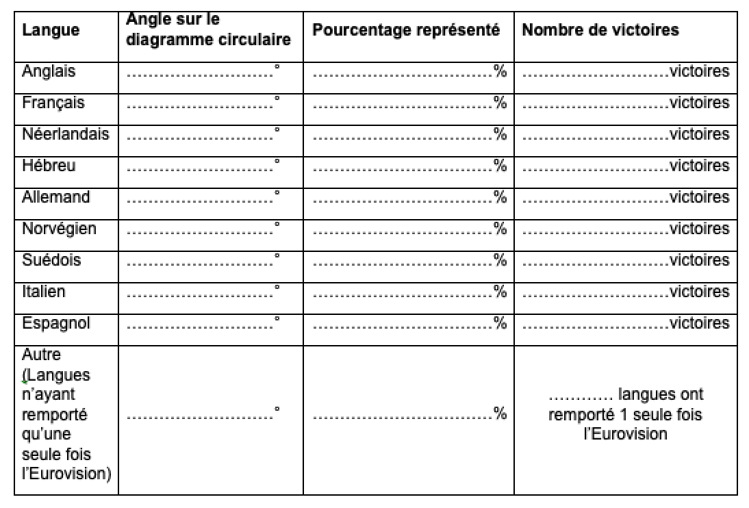 - En déduire, parmi les langues qui ont remporté l’Eurovision plusieurs fois, le nombre de fois où chaque langue a gagné l’Eurovision, ainsi que le nombre de langues n’ayant remporté qu’une fois l’Eurovision (arrondir à l’entier le plus proche).