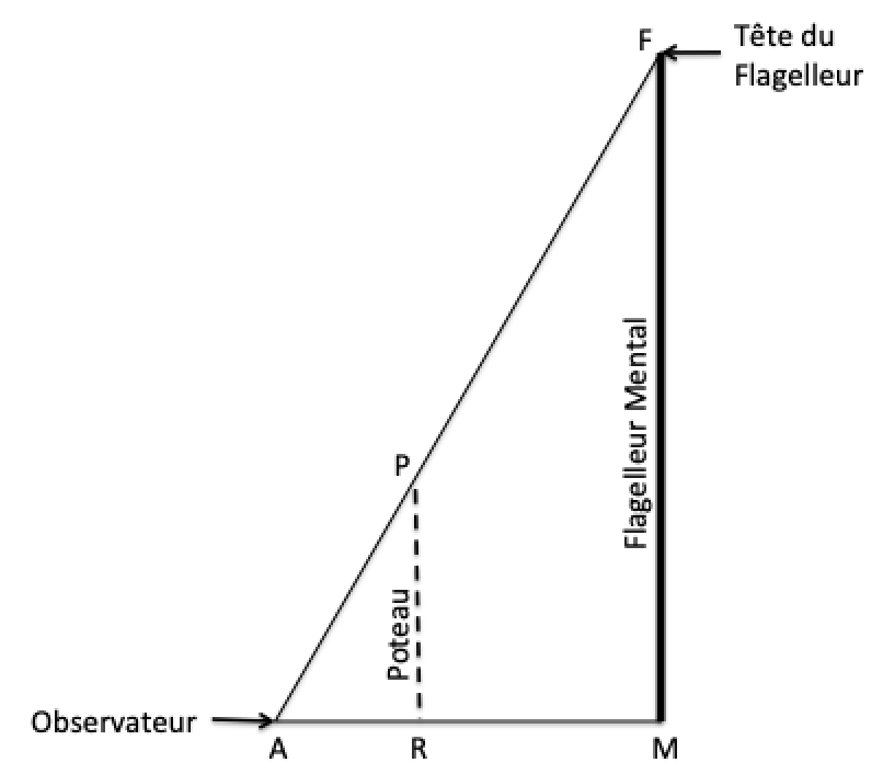 Pour estimer à partir de ce dessin la taille du monstre, on se propose la modélisation suivante. On imagine à partir du dessin qu’on est un observateur de la scène situé au sol au point A. Le poteau électrique, qu’on suppose vertical, a son pied situé au point R et le haut du poteau est au point P. On imagine que la tête du Flagelleur Mental est au point F, et que la projection verticale du point F au sol est un point M aligné avec A et R. La taille du Flagelleur Mental peut ainsi être estimée avec la longueur FM. On suppose également que le haut du poteau P est un point de [AF]. On représente ainsi la situation par le schéma suivant.