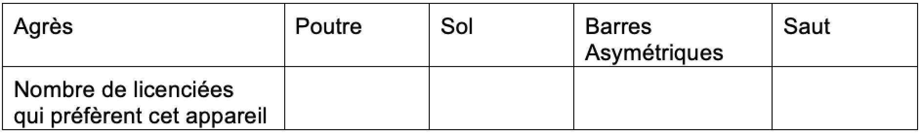 Dans un club de gymnastique comptant 228 gymnastes féminines, on a interrogé les licenciées pour savoir lequel des appareils, parmi les 4 agrès, elles préféraient.