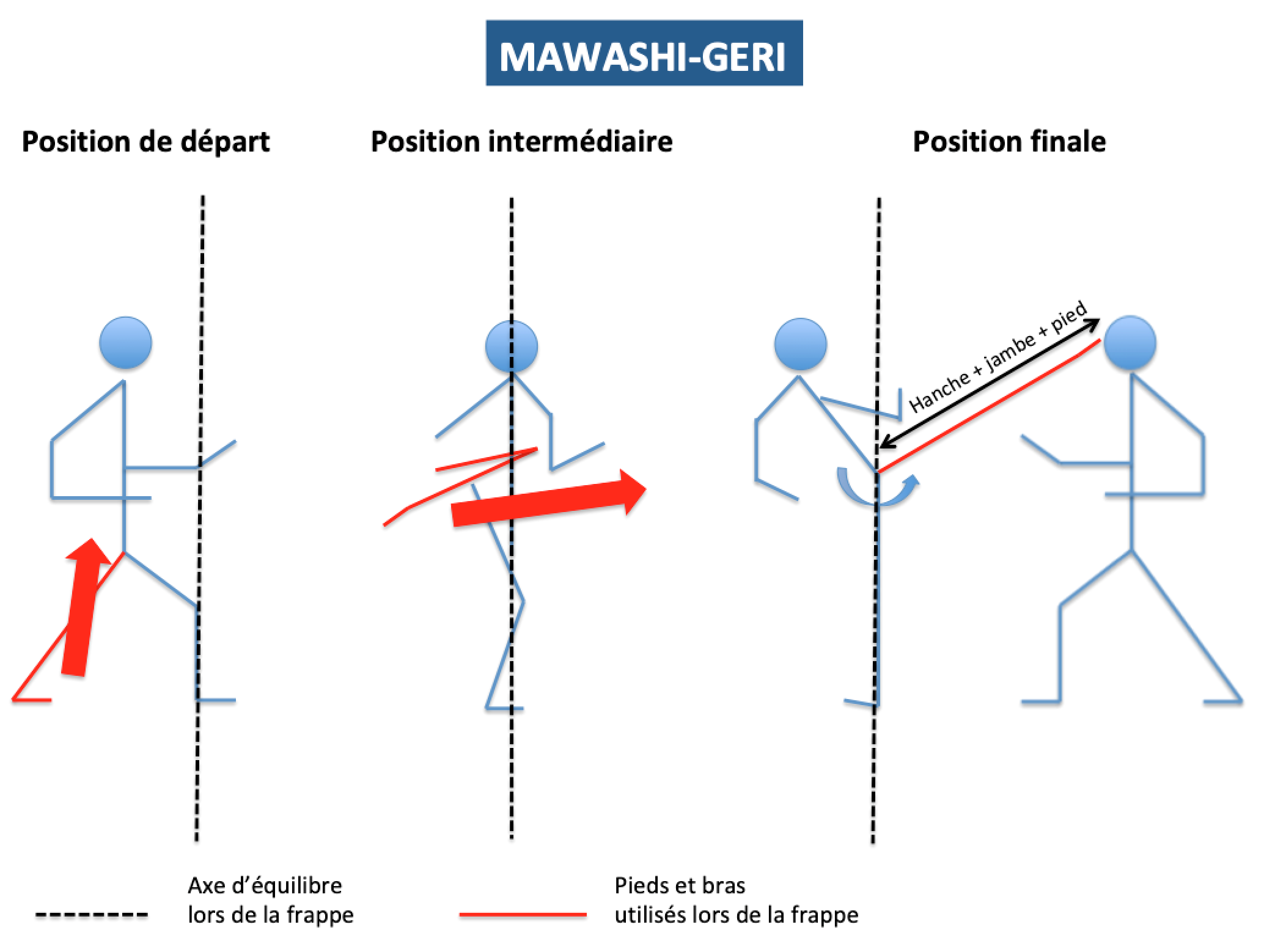 Mawashi-geri est un coup de pied également consistant à lever le pied arrière en le pliant vers l’arrière, avec un équilibre porté par la jambe avant, puis à l’aide d’un mouvement circulaire de la hanche, à aller frapper son adversaire, souvent à la tête, avec la jambe dépliée. Le mouvement circulaire de la hanche est fondamental, puisqu’il donne de l’élan et de la puissance au coup. Par ailleurs, plus la partie supérieure du corps est balancée vers l’arrière, plus le combattant va pouvoir allonger sa distance de frappe puisqu’il bénéficiera non pas seulement de la longueur de sa jambe, mais aussi de celle de toute sa hanche.