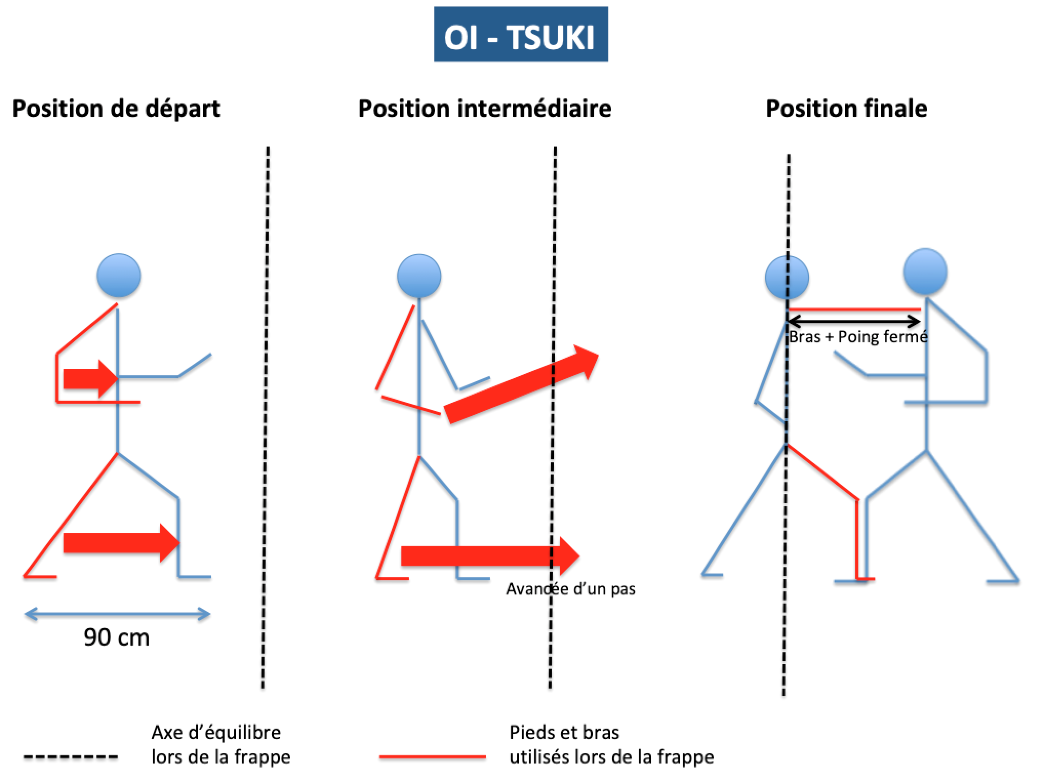 Oi-tsuki est généralement la première technique de poing apprise en karaté. Elle consiste à, partir de la position zenkutsu-dachi de départ, à donner un coup de poing avec celui placé à l’arrière, tout en avançant la jambe arrière (sans bouger celle de devant, sauf le pied qui doit s’ouvrir un peu) pour se retrouver à la fin en position de zenkutsku-dachi, mais avec les jambes inversées. Le combattant a donc fait un « grand » pas avant, tout en frappant.