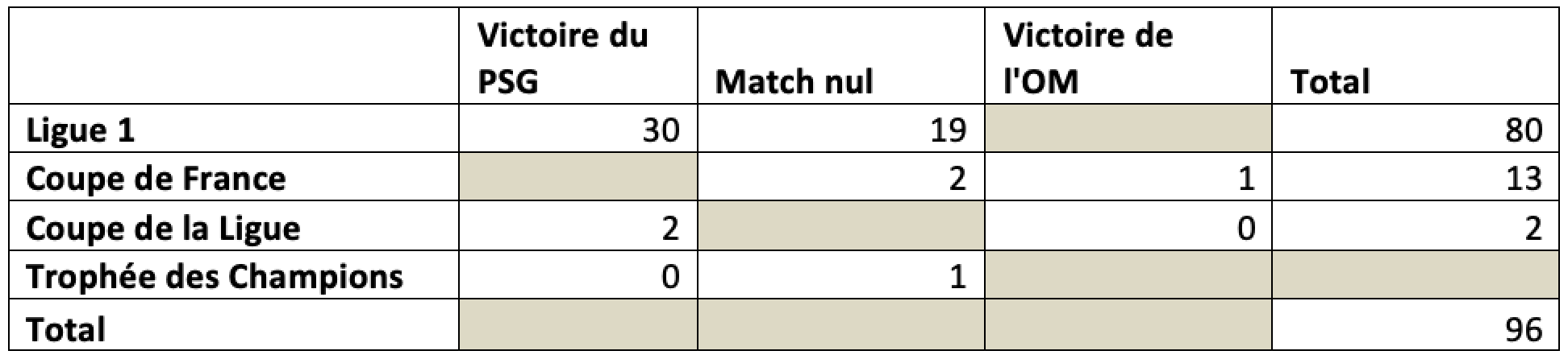On s’intéresse dans ce problème aux statistiques des matchs entre les deux équipes. Le PSG et l’OM se sont toujours rencontrés dans le cadre d’épreuves nationales : le championnat (la Ligue 1), la Coupe de France, la Coupe de la Ligue et le Trophée des Champions.