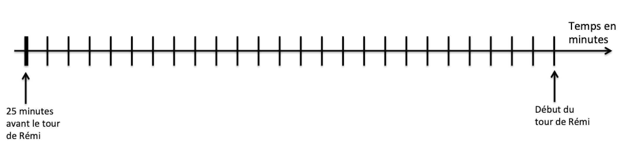 Indication : pour répondre à cette question, on pourra utiliser une flèche graduée représentant le temps (comme ci-dessous), en utilisant comme point de repère le début du tour de Rémi.