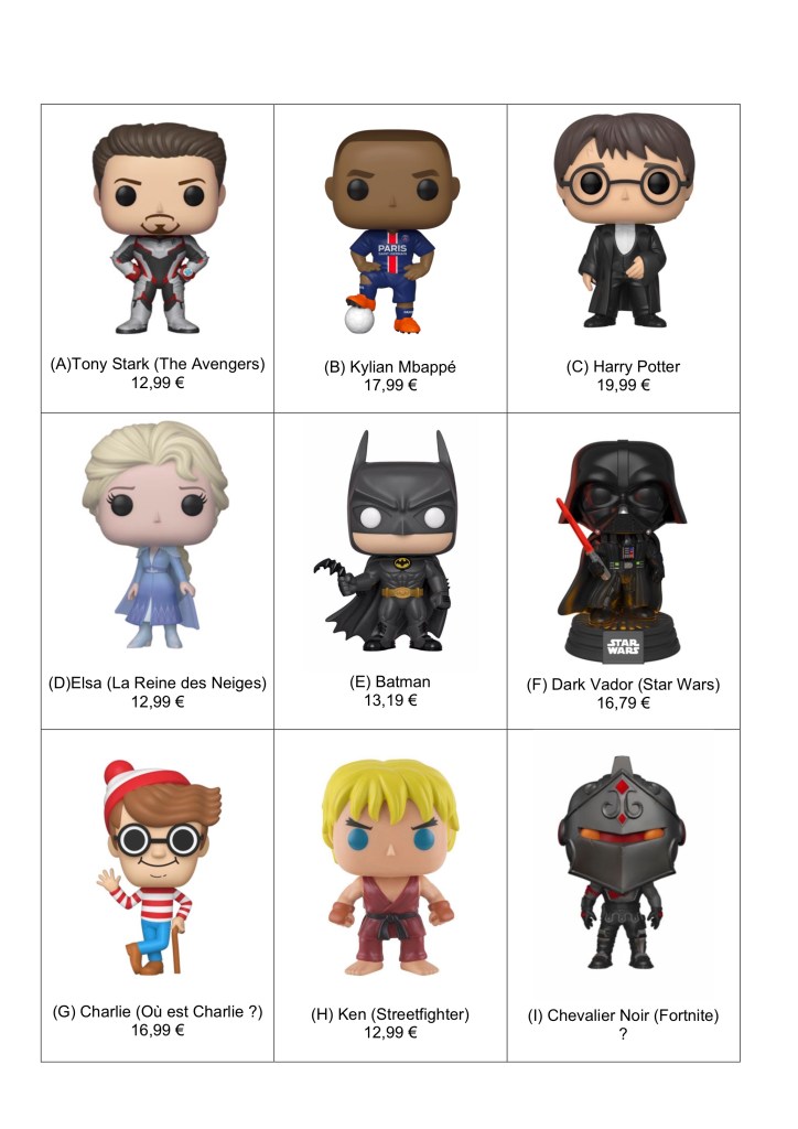 4) Romain est décidé : il achète au minimum les 4 figurines Tony Stark (A), Batman(E), Charlie (G) et Ken (H). Il cherche à savoir s’il peut acheter, en plus, la figurine de Kylian Mbappé (B).