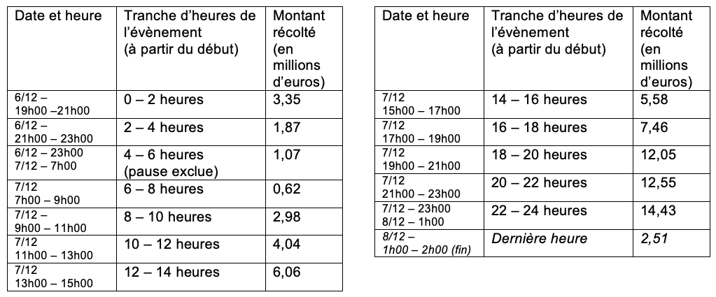 1) Quel a été le montant moyen récolté, en millions d’euros, dans une tranche de deux heures ?