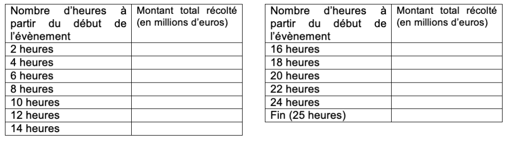 3) a) A l’aide des données du Tableau 1, remplir le Tableau 2 ci-dessous, qui indique le montant total récolté (on dit le montant « cumulé ») au bout d’un certain nombre d’heures à partir du début de l’évènement (arrondir au centième de millions d’euros).