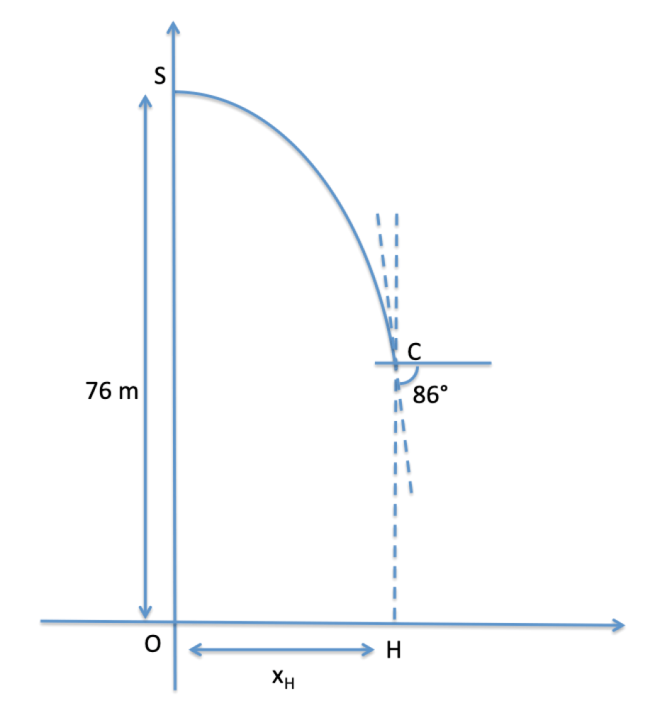 On a schématisé sur la Figure 1 la forme supposée de la parabole, dont on a centré le sommet sur l’axe des ordonnées dans un repère orthonormé, dont l’unité est le mètre. La parabole est tracée entre le sommet S, situé à 76 mètres de hauteur, et le point d’inflexion supposé C. La projection perpendiculaire au sol de ces points sont respectivement les points O (l’origine du repère) et H.