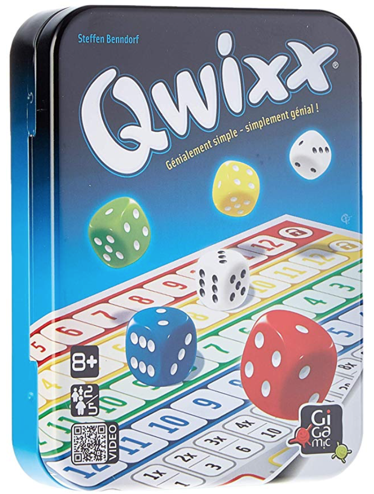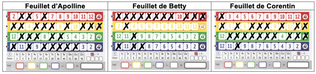 Apparu en 2012 en Allemagne, Qwixx est rapidement devenu un jeu très populaire notamment grâce à ses règles très simples. Son principe : chaque joueur doit essayer, sur son feuillet personnel (voir la grille sur l’Exemple 1) de cocher le plus de cases possibles sur 4 lignes colorées en rouge, jaune, vert et bleu, en lançant les dés et en cochant les cases correspondant à la somme de deux dés. Un joueur, selon qu’il lance ou non les dés, peut cocher de 1 à 2 cases par lancer, et est obligé de remplir les lignes de gauche à droite. A la fin du jeu, on regarde combien de cases ont été cochées par ligne (12 cases maximum, en incluant éventuellement celle la plus à droite qui est un bonus). Ce nombre de cases correspond, selon un barème visible en bas du carton, à un nombre de points par ligne – le score final (hors pénalités, que nous négligerons ici) étant la somme des points donnés par les 4 lignes. Dans ce problème, nous allons justement nous intéresser à ce barème et à son importance.