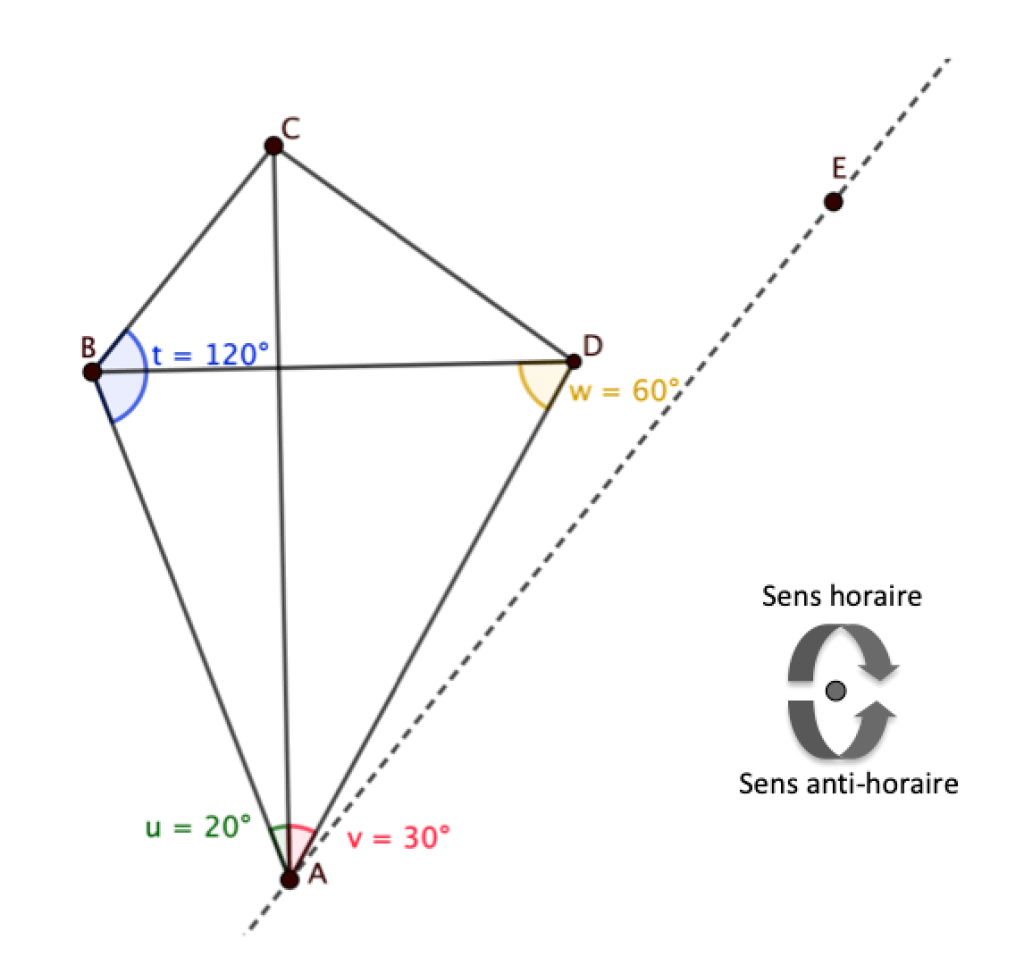 * Si Anthony vise Bastien, il doit tourner de 20 degrés (angle noté u) dans le sens horaire pour viser Cédric, et devra tourner de 30 degrés de plus (angle noté v), toujours dans le sens horaire, pour viser Denis.