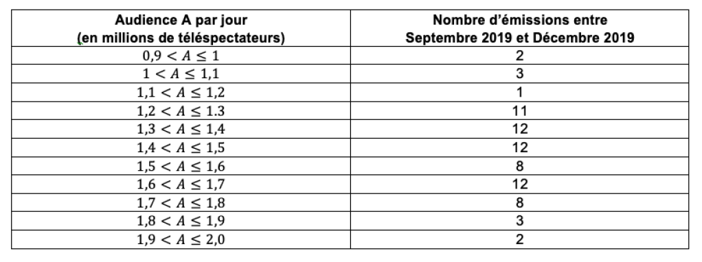2) Déterminer dans quelle tranche d’audience de 100 000 téléspectateurs se situe la médiane Me1 de l’audience, chaque jour, de l’émission entre Septembre 2019 et Décembre 2019.