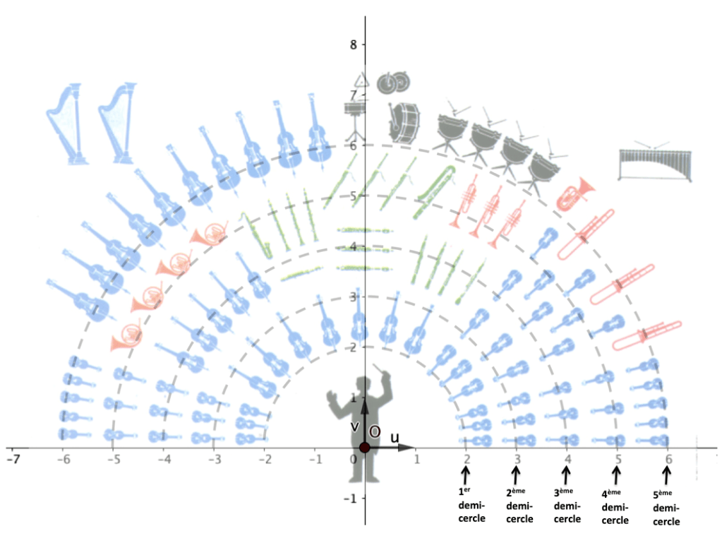 Dans ce problème, nous nous intéressons à la position des musiciens dans un orchestre. On considère que le pupitre du chef d’orchestre est positionné à l’origine d’un plan complexe muni d’un repère orthonormé (O, u, v), u étant orienté vers la droite du chef d’orchestre, et v en face de lui. On considère que ||u|| = ||v|| = 1 mètre. On suppose aussi (bien que cela change d’un morceau à un autre) que le chef d’orchestre a en face de lui, sur un demi-plan, tous ses musiciens (hors harpiste et xylophoniste) positionnés sur 5 demi-cercles de centre O et de rayons entiers, de 2 mètres pour le 1er demi-cercle (où l’on trouve uniquement les vents) à 6 mètres pour le 5ème demi-cercle (sur lesquels on peut trouver, entre autres, les percussions) (voir Figure 1).