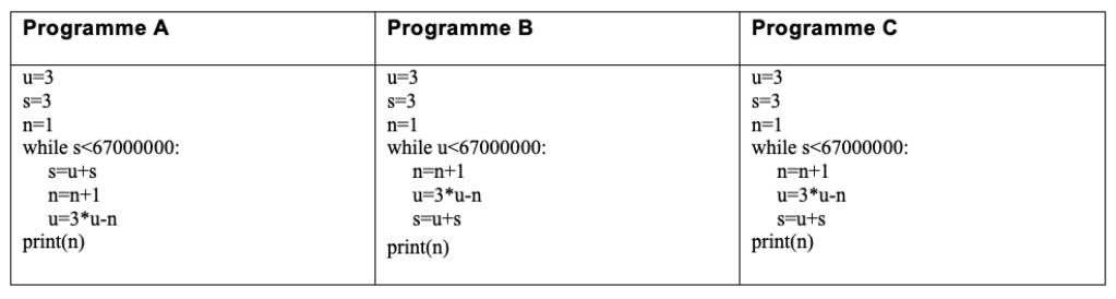 4) a) Parmi les 3 programmes Python proposés ci-dessous, quel est celui qui donne le nombre de jours au bout desquels toute personne Française (on dira qu’il y en a 67 millions – sans besoin d’inclure Audrey !) aura reçu un appel à travers cette chaîne de solidarité lancée par Audrey ?