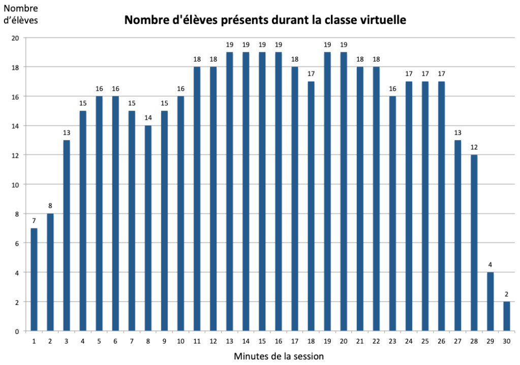 Confinement oblige, de nombreux professeurs dispensent leurs cours en utilisant les outils de classe virtuelle. C’est une autre manière d’enseigner, qui a surtout le mérite de ne pas laisser les élèves seuls devant des leçons parfois difficiles à assimiler. La classe virtuelle change aussi du cadre usuel de la classe car il est facile pour des élèves d’aller et de venir (parfois au bon vouloir de la qualité de la connexion Internet), ce qui fait que tout au long d’une session, le nombre d’élèves peut varier beaucoup.