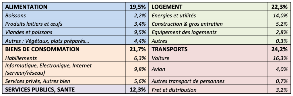 2) Le site Ravijen(4) propose une analyse, souvent reprise dans les médias, des sources d’émissions de CO2 de chaque personne (en moyenne). Le Tableau 1 résume des données issues de cette étude, en regroupant et en détaillant les émissions provenant de 5 grands pôles : Alimentation, Biens de consommation, Services Publics et Santé, Logement, et Transports.