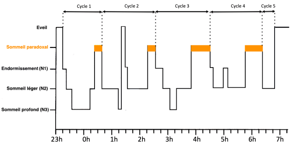 Un cycle peut passer par les quatre stades N1, N2, N3 et sommeil paradoxal, mais ce n’est pas toujours le cas : tous les cycles ne sont pas identiques sur une nuit.