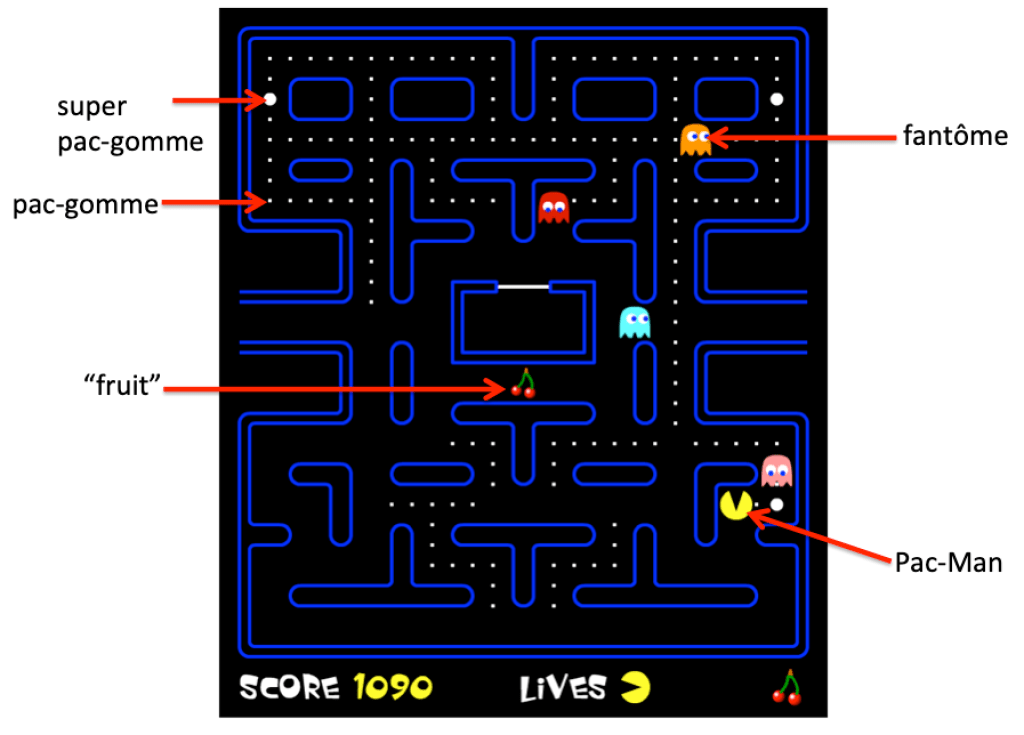 Si il ne fallait élire qu’un seul jeu parmi les premiers jeux vidéos les plus populaires de l’histoire, Pac-Man aurait sans doute une bonne place parmi les favoris, à côté des autres Tetris, Zelda, et Super Mario Bros. Le 22 Mai dernier, Pac-Man fêtait ses 40 ans : l’occasion pour nous de revenir sur ce petit rond avec une bouche qui mange des pac-gommes (des petits points) tout en évitant les 4 fantômes qui le pourchassent. Sur un certain nombre de niveaux, Pac-Man peut temporairement manger les fantômes s’il avale des super-pac gommes (des gros points brillants) et il peut avoir des points bonus s’il arrive à manger des « fruits » (on les appellera ainsi, même si ils ne sont pas tous des fruits !) (voir l’image en Annexe 1 pour une description visuelle). Avec ces simples règles du jeu, nous allons dans ce problème retrouver un nombre devenu légendaire : celui du nombre de points maximum qu’un joueur peut obtenir s’il réalise la partie parfaite.