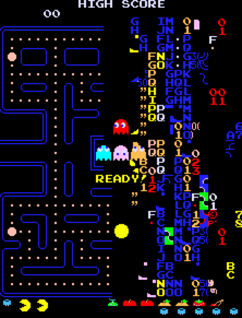 4) Le joueur qui arrive au niveau 256 voit apparaître un niveau étrange où il ne peut jouer que sur la moitié de l’écran (Voir Annexe 3). Sur ce niveau il y a 112 pac-gommes, 2 super pac-gommes, 1 seul « fruit » (la clé) au lieu de 2, et enfin 9 pac-gommes supplémentaires, qui, par magie, réapparaissent chaque fois que le joueur perd un Pac-Man (sachant que s’il a fait une partie parfaite, un joueur dispose en tout de 6 vies quand il commence le niveau 256).