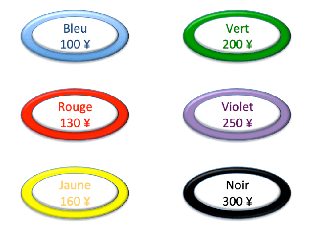 Nous suivons dans ce problème Lucille, qui, cette année, a voyagé avec son frère, sa sœur et ses parents au Japon. Ils ont naturellement décidé de faire l’expérience du sushi bar. Ils sont allés dans un restaurant de Tokyo où le code couleur du prix des assiettes était celui en Annexe 1. On rappelle que la monnaie au Japon est le Yen, noté ¥. On admet pour ce problème que le taux de conversion est de 1 € pour 120 ¥.