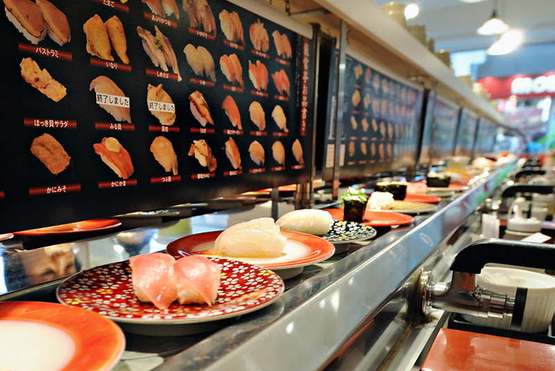 Le kaiten-sushi (回転寿司, littéralement le « sushi tournant»), plus communément connu sous le nom de « sushi bar », est une expérience incontournable pour tout voyageur au Japon – bien qu’il soit maintenant commun de trouver de tels restaurants partout dans le monde. Dans ces restaurants, les sushis sont servis dans des assiettes qui font le tour des tables sur un tapis roulant. Les clients se servent librement en prenant les assiettes qui passent devant eux. Très souvent, le prix de l’assiette va dépendre de la couleur de l’assiette prise. Ainsi, après le repas, toutes les assiettes prises sont empilées et il est facile de calculer visuellement l’addition en regardant les couleurs.
