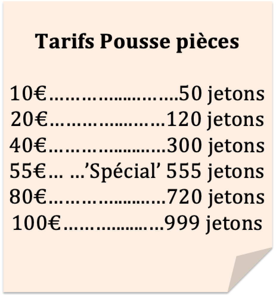 Bien sûr, pour commencer, il faut toujours acheter des jetons pour les insérer. En ce jour de fête foraine, un propriétaire de machines de pousse pièces a fixé des tarifs qui permettent d’acheter des bols avec un certain nombre de jetons : ces tarifs sont visibles dans l’Annexe 1.