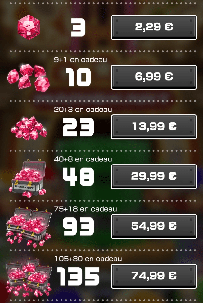 Annexe 1 – Prix des packages de rubis de Mario Kart Tour