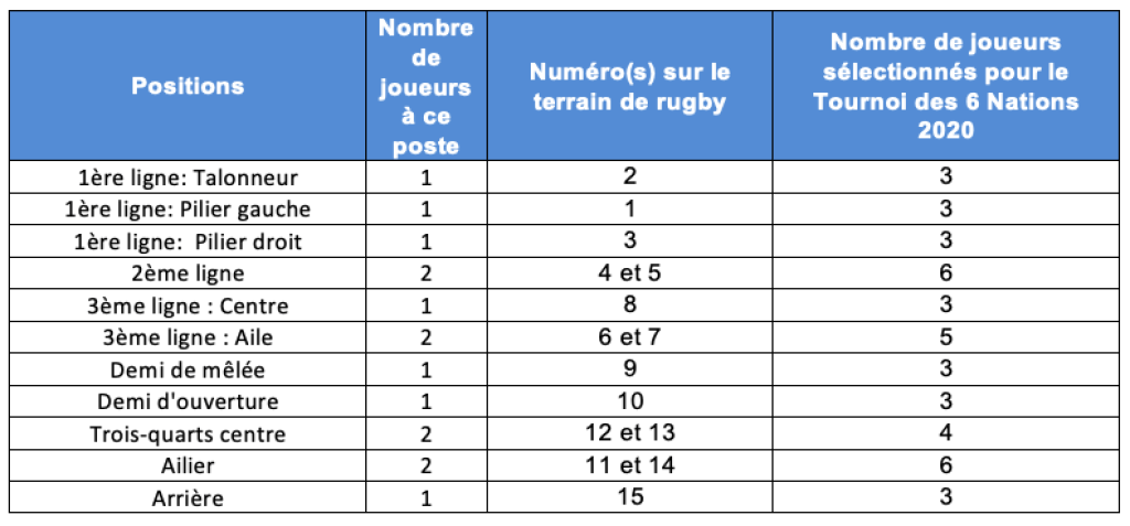 3) De manière plus générale, pour choisir ses 28 joueurs présent au match, le principe est le suivant : Fabien Galthié s’assure d’avoir 2 joueurs disponibles pour chacun des numéros d’une équipe (donc une première sélection de 30 joueurs), puis il enlève 1 joueur pour 2 positions – sachant qu’il ne peut pas se permettre d’enlever un joueur présent en 1ère ligne et qu’il ne peut pas enlever 2 joueurs sur une seule position.