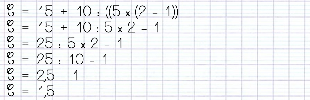 3) Calculer : C = 15 + 10 : ((5 x (2 – 1))
