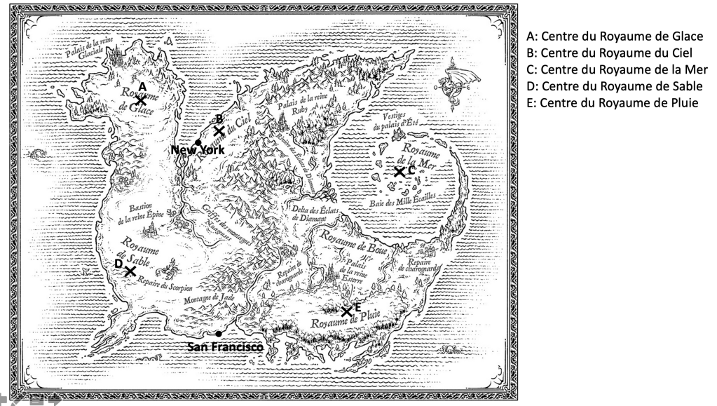 Le continent Pyrrhia, le lieu imaginaire où se déroule l’ensemble de l’action des cycles 1 et 2 (qui comprennent chacun 5 tomes), est représenté en Annexe 1. Ce continent est divisé en grands royaumes (Royaume de Glace, Royaume de Sable etc…) pour lesquels on a indiqué, par différents points, les centres respectifs. Ces royaumes sont associés aux différents clans de dragons : les « Ailes » (Ailes de Glace, Ailes de Sable….). La taille exacte de Pyrrhia n’a jamais été explicitement décrite, mais certains évoquent que Pyrrhia serait similaire sous certains aspects au continent américain(1). Ainsi, sous cette hypothèse, on a imaginé ce que seraient les positions des deux villes opposées aux extrêmes des Etats-Unis, New York et San Francisco, sur la carte de Pyrrhia. Les deux villes sont séparées dans la réalité de 4 130 km.