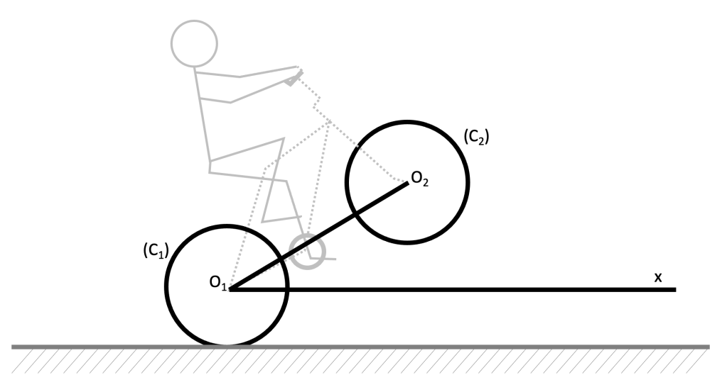 La situation est modélisée en Annexe 1. Dans la situation initiale, Félix fait tenir son vélo sur la roue arrière, représentée par un cercle (C1) de centre O1, et lève sa roue avant, représentée par un cercle (C2) de centre O2. Bien que le vélo soit en mouvement permanent, on considèrera durant tout le problème que la roue arrière est fixe et que seule la roue avant se lève ou se baisse.