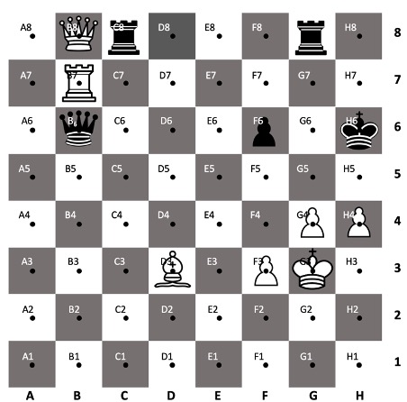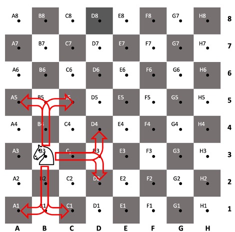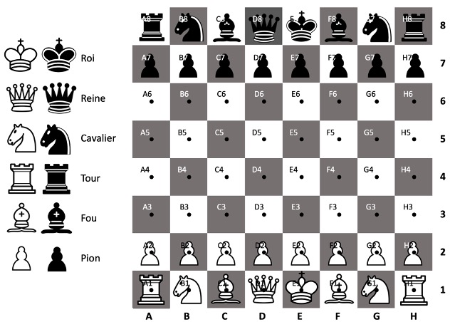 Dans l’ensemble du problème, on repérera les centres des cases (donc des points) par un code constitué d’une lettre (de A à H) pour repérer les colonnes et d’un numéro (1 à 8) pour repérer les lignes. On supposera que les pièces sont toujours parfaitement centrées dans les cases.