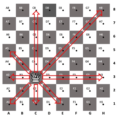 On rappelle qu’un jeu d’échecs se joue sur un échiquier, qui est une grille de 8 cases sur 8 cases avec des cases noires et blanches alternées. Deux joueurs.ses, l’un.e avec les pièces blanches, l’autre avec les noires, s’affrontent avec un lot de 16 pièces chacun.e (Annexe 1). Chacune des pièces peut faire un certain type de mouvement (nous ne les décrirons pas tous). Par exemple, un pion ne peut avancer que d’une case et uniquement vers l’avant (ou deux uniquement au premier mouvement du pion) (Annexe 2a) ; un cavalier peut faire un mouvement consistant à faire un déplacement de deux cases en horizontal ou vertical (Annexe 2b), plus une case dans la direction perpendiculaire; enfin une reine peut se déplacer tout le long des lignes, colonnes ou diagonales sur lesquelles elle se situe (Annexe 2c).