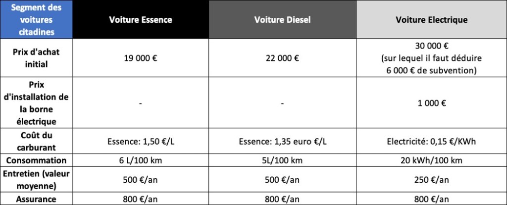 Le tableau en Annexe 2 résume des données estimées sur les 3 modèles de véhicules – essence, diesel, électrique – dans le segment des petites citadines visé par les parents de Charlie.