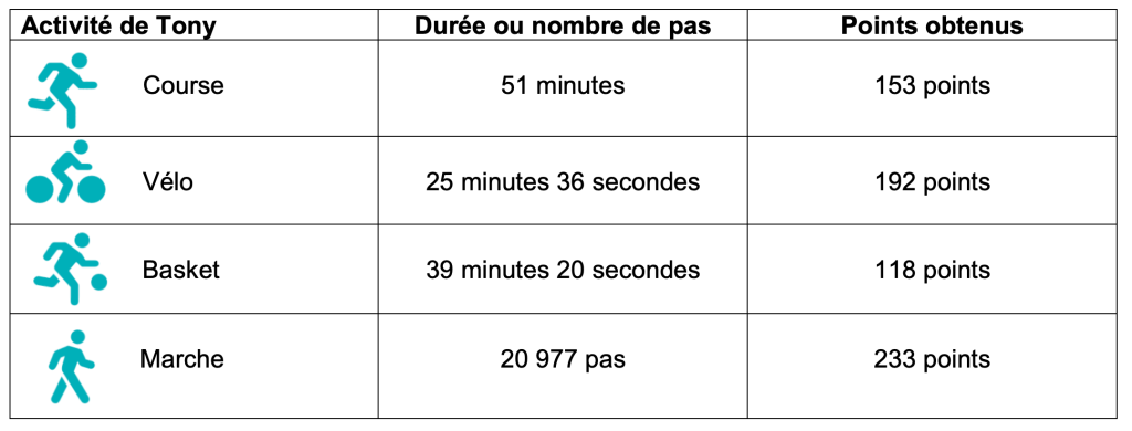 3) Ce week-end Tony a couru 1 heure 10 minutes, fait 56 minutes de vélo et 2 heures de basket, avec 42 000 pas en tout. Calculer le nombre de points qu’il a obtenu ce week-end.