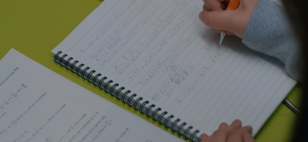 Dans tout le premier épisode de la première saison, alors qu’on commence à peine à prendre connaissance des personnages, on voit Kim Jojo en train de travailler sur plusieurs exercices de probabilités. Le film permet même d’entrapercevoir le cahier de Kim Jojo (voir Image 1 – on remarquera que certaines notations ne sont pas celles apprises en France).