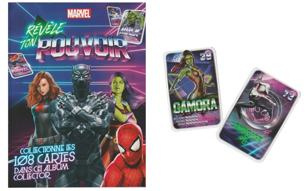 L’album en question comprend 79 cartes de super-héros (dont 4 cartes avec le personnage Black Widow) et 29 cartes de pouvoirs. Uniquement parmi les cartes de super-héros, deux d’entre elles (Iron Man et Spider-Man) sont des cartes « Snapchat ». On trouve aussi, réparties à la fois parmi les cartes de super-héros et les cartes de pouvoirs, 5 cartes scintillantes et 5 cartes holographiques. Les autres cartes sont des cartes qu’on considèrera « normales ».