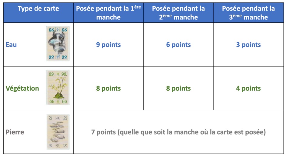 – 1 carte « eau », 2 cartes « végétation » et 4 cartes « pierre » à la troisième manche.