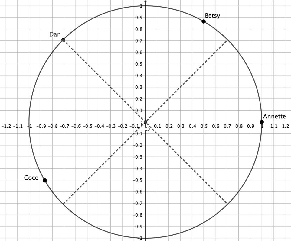1) Donner pour chaque participant indiqué sur le schéma en Annexe (sauf Annette) le nombre dans l’intervalle ]-π ,π] dont la position du participant est le point image.