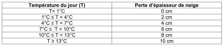 - les jours où il ne neige pas, la hauteur de neige va plus ou moins diminuer : cela dépend de la température. Le tableau en Annexe 2 propose une correspondance simplifiée entre la température du jour et l’épaisseur perdue de neige.