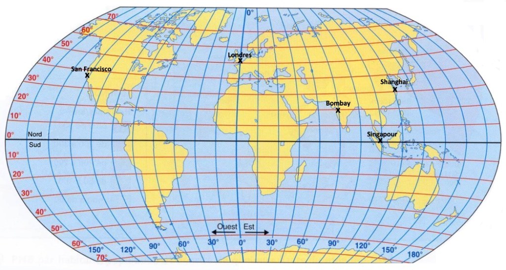 1) En Annexe, on a placé, sur une carte du monde, quelques-unes de ces villes : Bombay, Londres, San Francisco, Shanghai, Singapour.