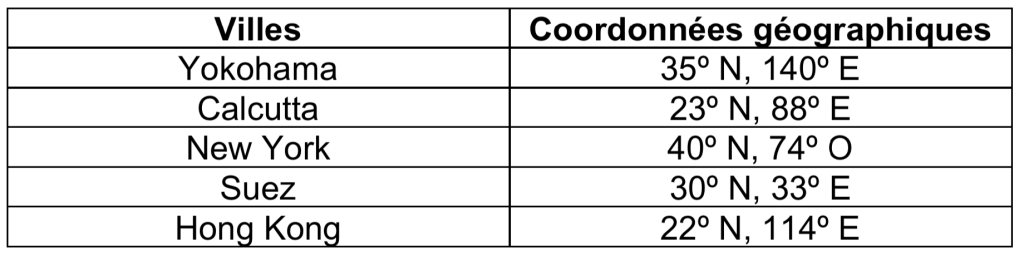 2) Ci-dessous, on a indiqué les 5 autres villes principales de l’itinéraire de Phileas Fogg, avec leurs coordonnées géographiques.