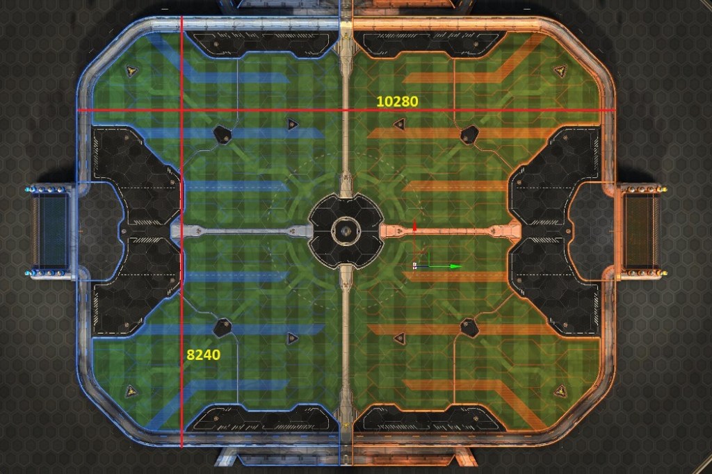 L’unité de mesure des terrains de Rocket League se mesure en « unité irréelles » – ou « Unreal Units », qu’on abrègera en U.U. Ainsi le terrain le plus utilisé pour les matchs, le DFH Stadium, est un rectangle, coupé aux quatre coins, qui mesure 10 280 U.U. de longueur sur 8 240 U.U. de largeur (voir Annexe(1)). Pour simplifier, on dira simplement que c’est un rectangle (on ignorera le fait qu’il est coupé aux quatre coins). Un ballon de jeu est assimilé à une sphère de rayon 92,75 U.U.(2) et une voiture de jeu a une longueur de 144 U.U.(3).