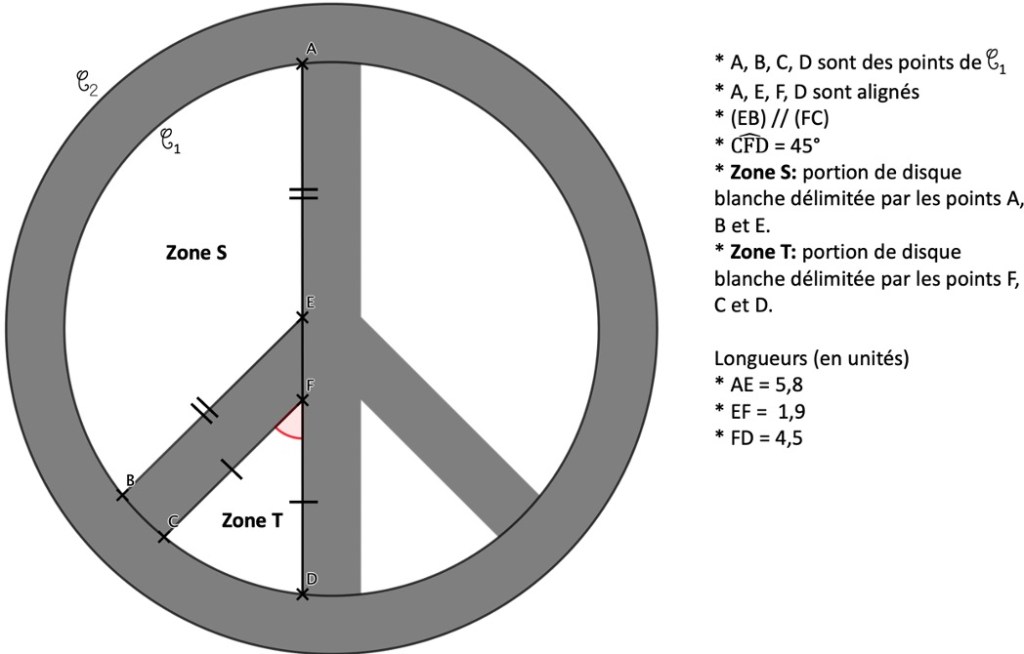 Ce symbole présente évidemment une symétrie axiale, et est composé d’une zone noire située entre deux cercles de même centre O, C1 (intérieur) et C2 (extérieur). A l’intérieur, on trouve 3 branches : une branche centrale verticale et deux autres branches qui forment des bras à gauche et à droite, tombant en faisant un angle de 45 ° avec la branche verticale. Afin de simplifier la compréhension du problème, on a nommé sur la figure de l’Annexe quelques point-clés sur la figure, ainsi que quelques caractéristiques importantes (angle, longueurs et égalités de longueurs, parallélisme entre droites).