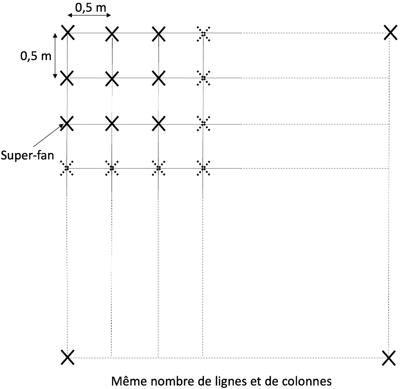 Revenons alors sur les 2,5 millions de ventes de l’album « Racine carrée ». On va supposer qu’un acheteur sur cent de cet album, soit 25 000 « super-fans », se réunissent pour célébrer leur idole dans un stade. Pour se regrouper, on va imaginer qu’ils vont essayer de former un carré géant : pour cela, ils se rangent tous en lignes et en colonnes, de manière parfaitement alignée, telle une armée, chaque super-fan étant toujours à 0,50 mètre d’un autre super-fan (voir principe en Annexe). Il est impératif qu’il n’y ait aucun trou dans les alignements, et qu’il n’y ait aucun super-fan laissé hors du carré formé. Par ailleurs, on ne peut pas mettre plusieurs super-fans sur une position.