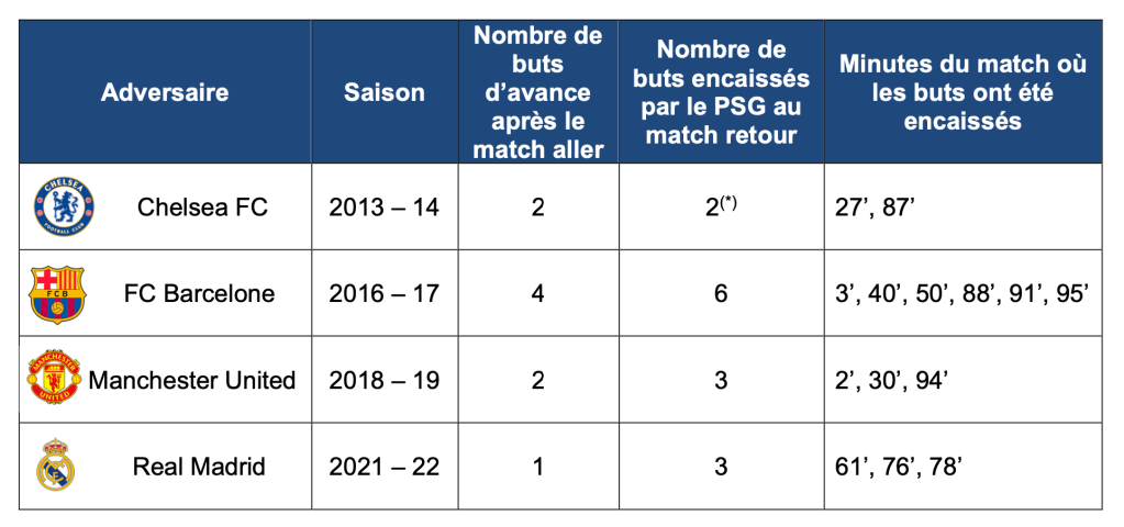 On rappelle, pour ceux qui ne regardent pas le foot, qu’un match à élimination directe de la Ligue de Champions se compose d’un match aller et d’un match retour. Dans ces dix dernières années, le PSG a principalement, parmi d’autres défaites, effectué quatre « descentada », après un match aller favorable. La liste est décrite en Annexe 1 : on lit dans ce tableau le nombre de buts d’avance qu’avait le PSG après le match aller, et le nombre de buts encaissés au match retour avec les minutes précises où le club a encaissé les buts. Dans les 4 cas, c’est toujours sur le tout dernier but encaissé que PSG s’est vu éliminé.
