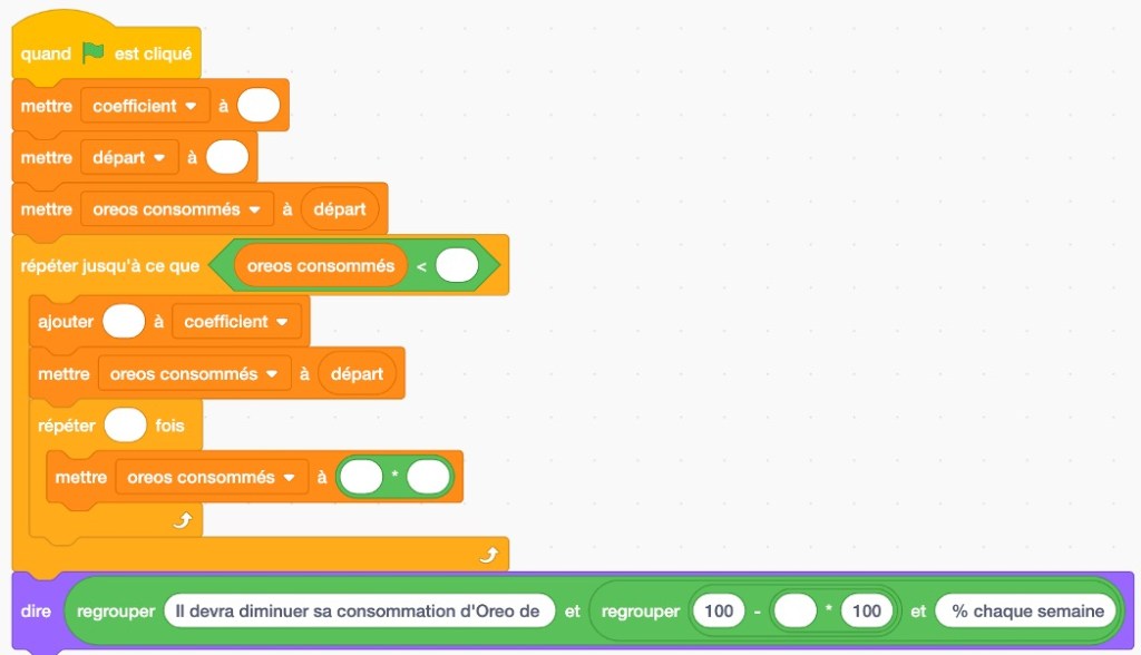 a) Compléter le programme Scratch en Annexe pour qu’il donne le plus petit pourcentage, au % près, par lequel Eric doit diminuer sa consommation d’Oreo d’une semaine à une autre pour atteindre son objectif.