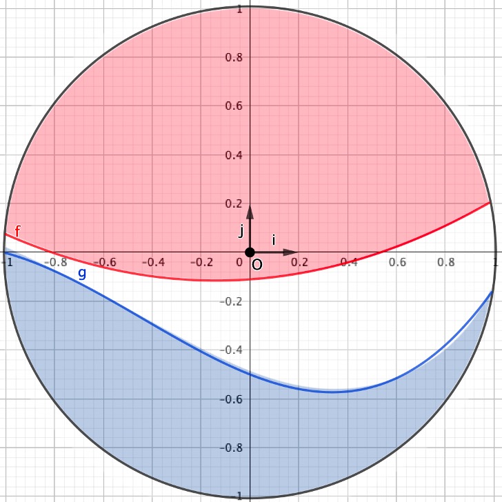 Pour cela, on considère le logo de Pepsi tel que le cercle soit de rayon 1. On place ce logo en situant le centre du cercle exactement à l’origine d’un repère orthonormé (O, i, j), et en faisant tourner le logo dans le sens des aiguilles d’une montre. En effectuant cette rotation, on se retrouve dans une situation où on peut alors admettre, même si c’est très légèrement incorrect, que la zone blanche se retrouve située entre les courbes représentatives de deux fonctions f et g définies sur [-1,1] par :