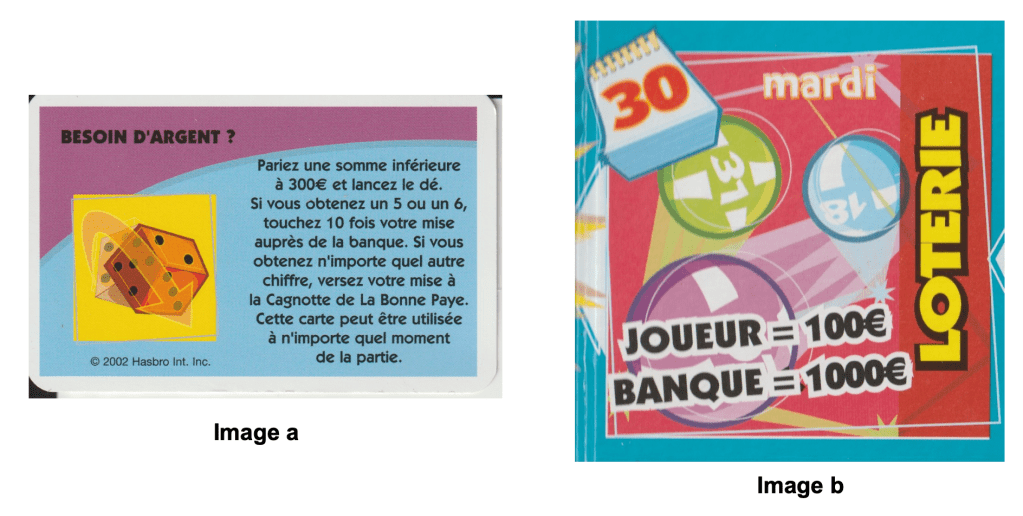 La Loterie, elle, est une case du jeu (Annexe, Image b) . Quand un joueur tombe dessus, tous les joueurs ont la possibilité de participer : ceux qui souhaitent jouer payent chacun 100 € et parient sur un numéro différent entre 1 et 6. Le dé est alors tiré : celui qui a donné le bon numéro remporte alors 1 000 €.