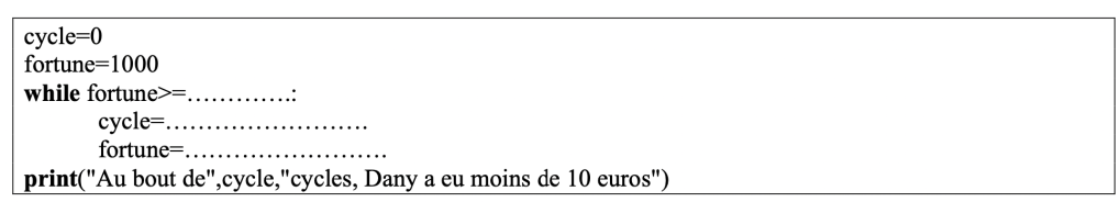 a) Remplir le script Python ci-dessous pour qu’il détermine au bout de combien de cycles phase chanceuse/phase de perte Dany a fini par posséder moins de 10 euros.